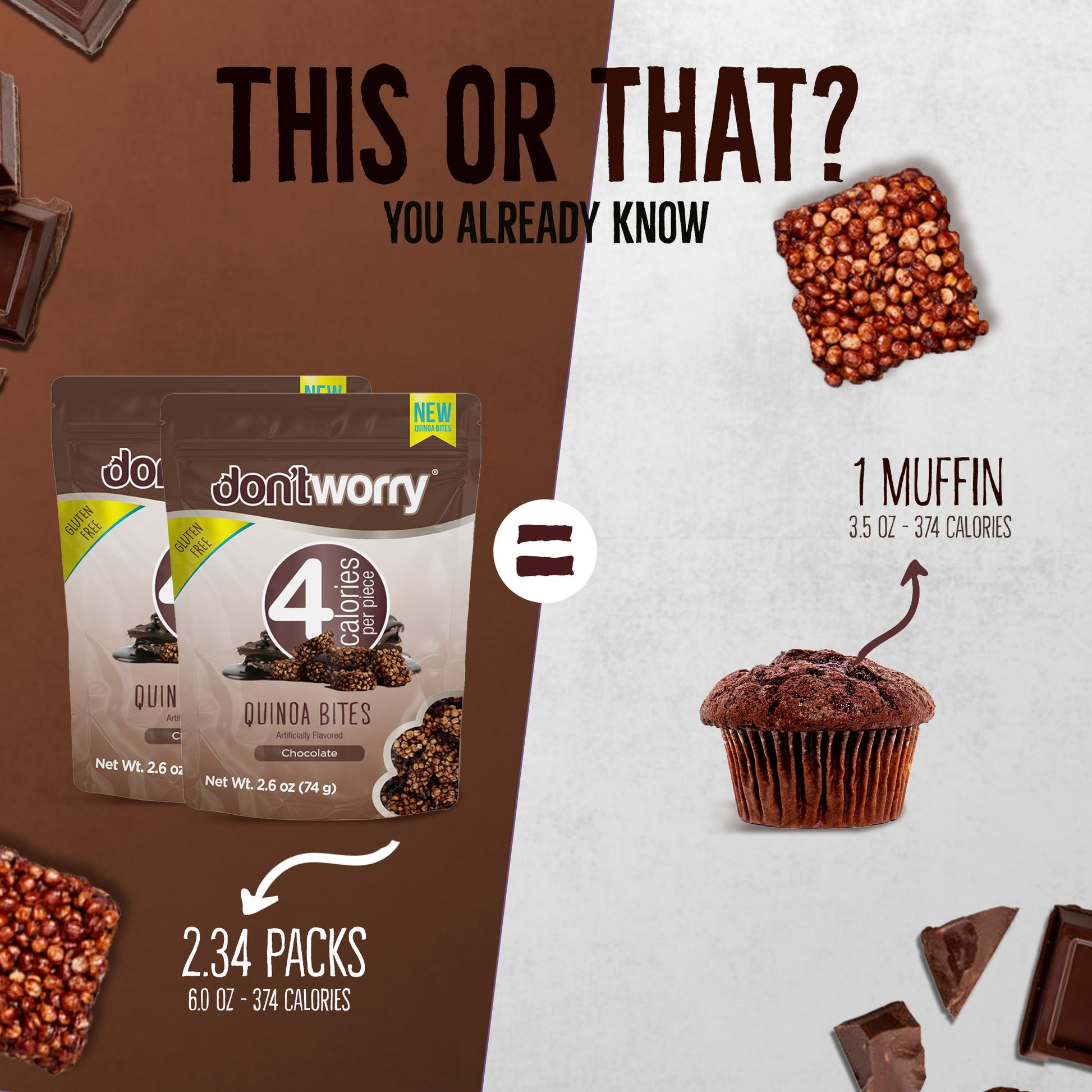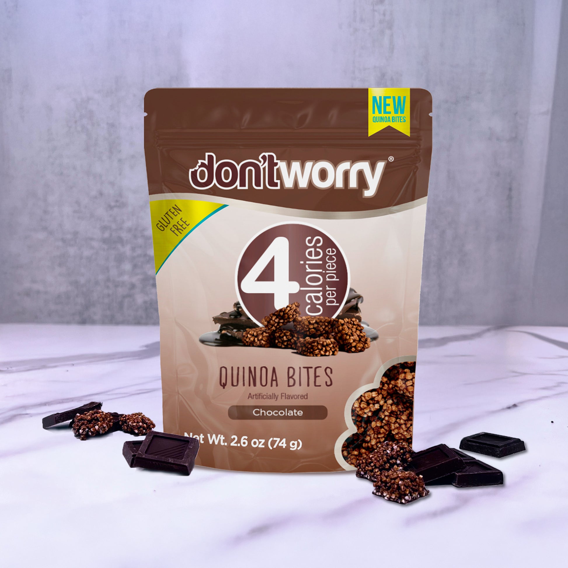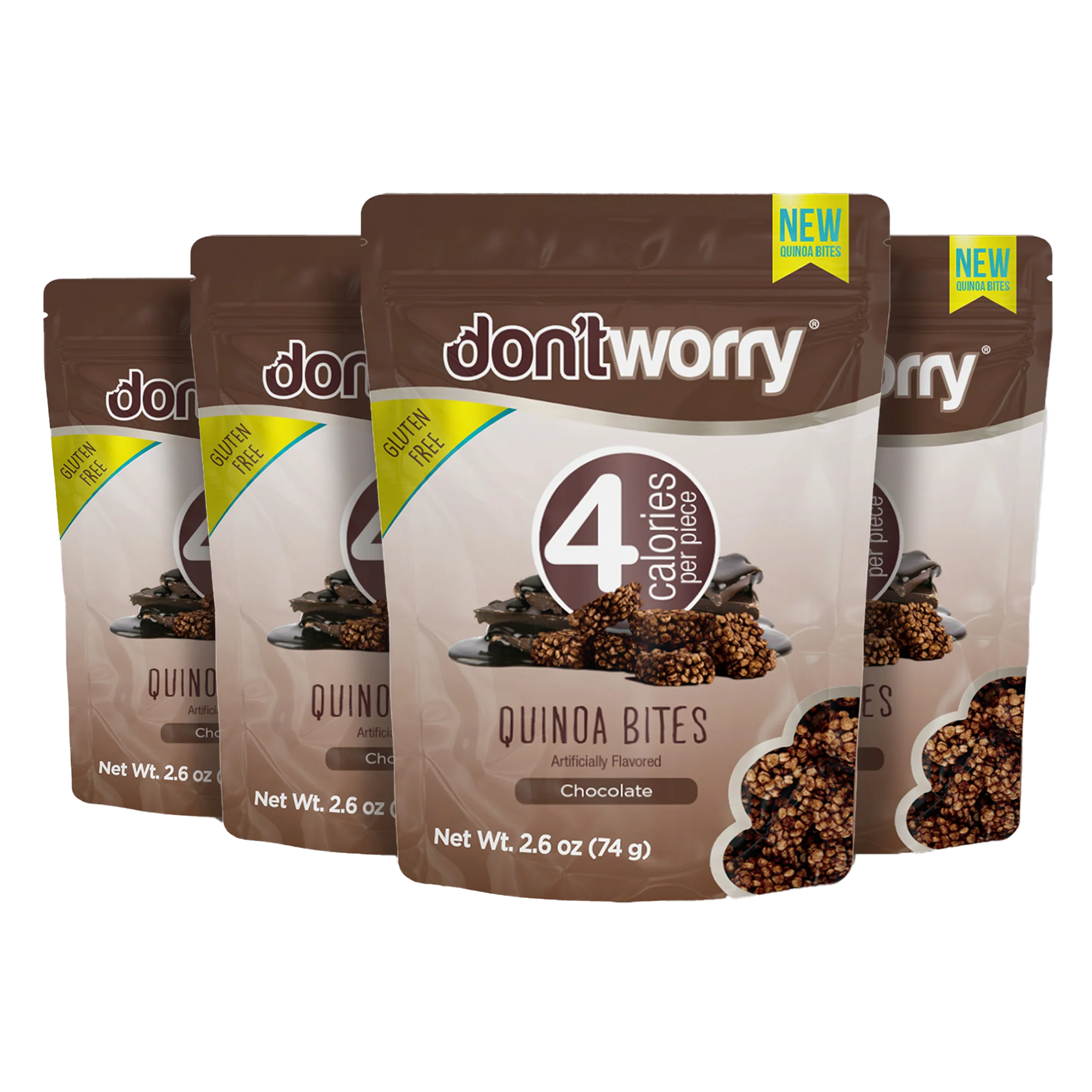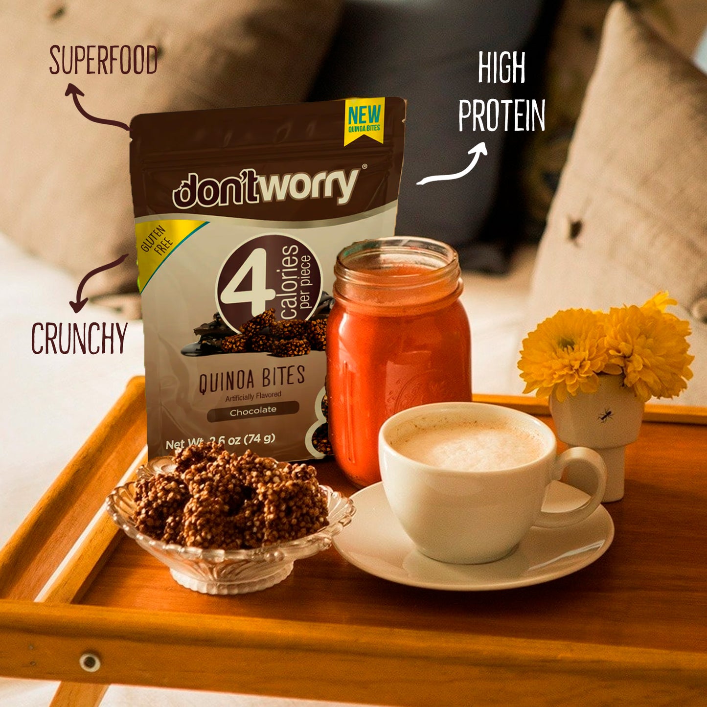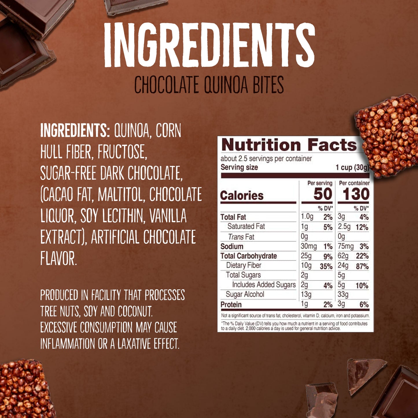 A 4-pack of our rich Chocolate Quinoa Bites. Only 5 calories per piece, gluten-free, sugar-free, and made with superfoods. Light, crunchy, and indulgent. Fuel your day with clean energy and flavor that satisfies guilt-free.