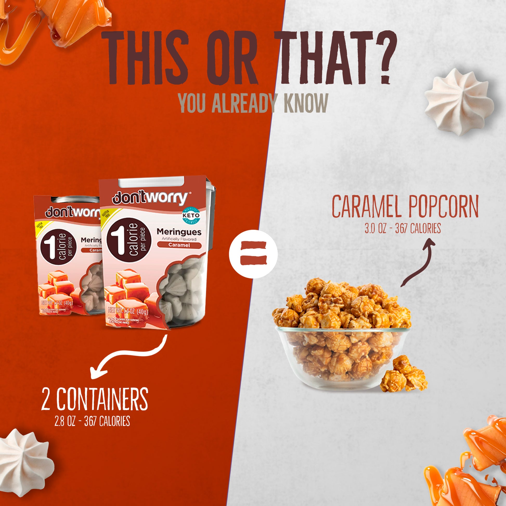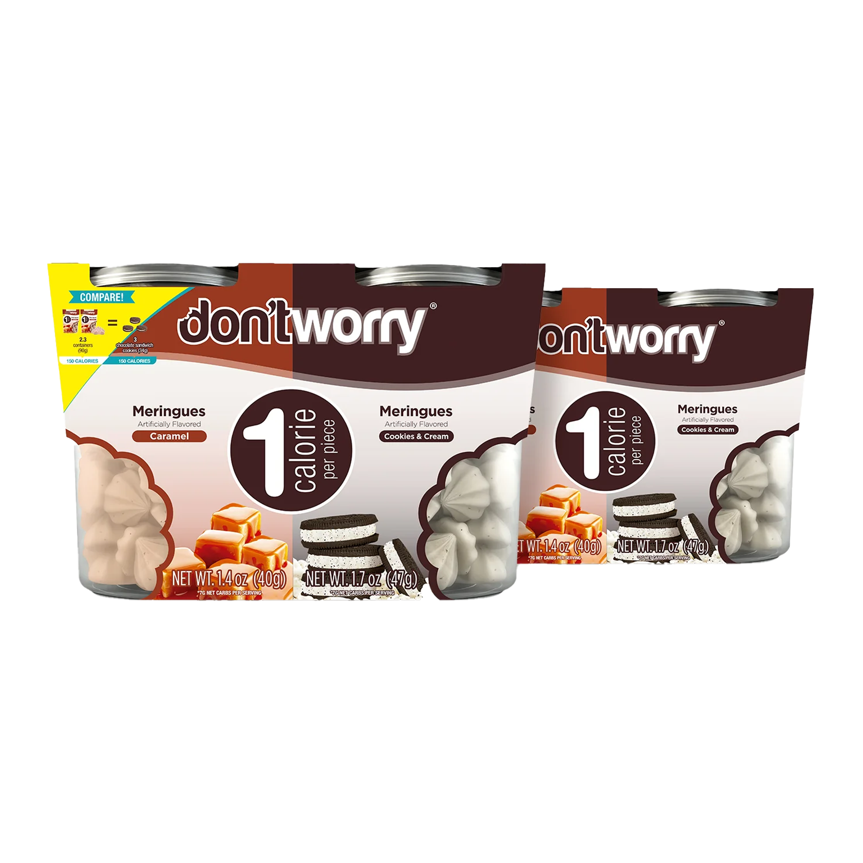 Two iconic flavors, double the joy. This 4-pack blends creamy cookies & cream with buttery caramel in light meringue form. Only 1 calorie per piece, sugar-free, and gluten-free. Delicious snacking made simple and satisfying.